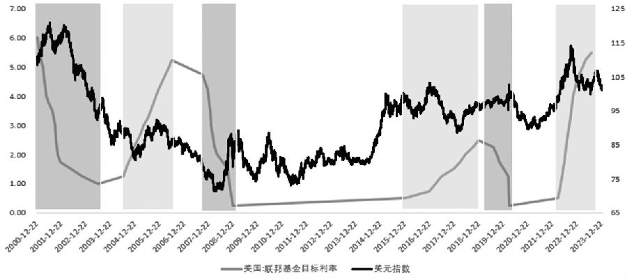 在美元周期中,美元指数和美国联邦基金目标利率并不同涨同跌,美元指数和美元周期也存在错位。因为美元指数不仅受到美联储加息的影响,还受到美国国力和美元信用等多方面因素的影响。因此即使在加息周期内,美国联邦基金目标利率上升,美元指数也会出现下跌的情况,如在2004—2006年、2015—2018年的两次加息周期中贬值,而在2022—2023年的加息周期中升值。在美元降息周期中,如在2000—2003年的降息周期中贬值,但是在2007—2008年、2019—2020年的降息周期中反而升值。