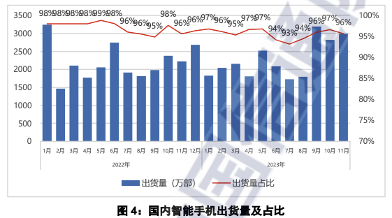 12月27日,中国信通院数据显示,2023年11月,智能手机出货量2985.6万部,同比增长34.4%,占同期手机出货量的95.7%。2023年1-11月,智能手机出货量2.50亿部,同比增长5.4%,占同期手机出货量的95.7%。